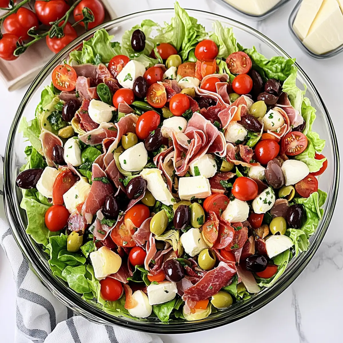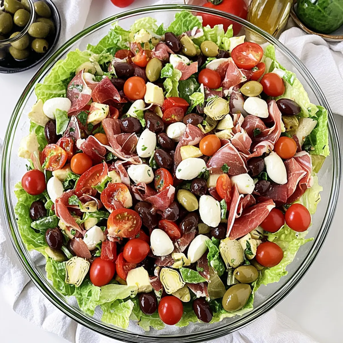 - Assemble the Salad: Layer ingredients over chopped romaine, starting with 1 cup of halved cherry tomatoes and 1 cup of mozzarella cheese pearls, followed by 4 ounces of soppressata or Genoa salami, 2 ounces of prosciutto, ½ cup of Kalamata olives, 1 cup of marinated artichoke hearts, and ½ cup of roasted red peppers.