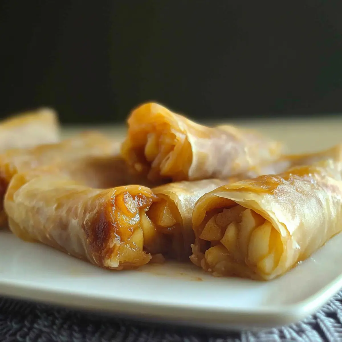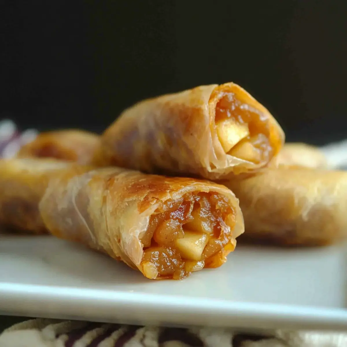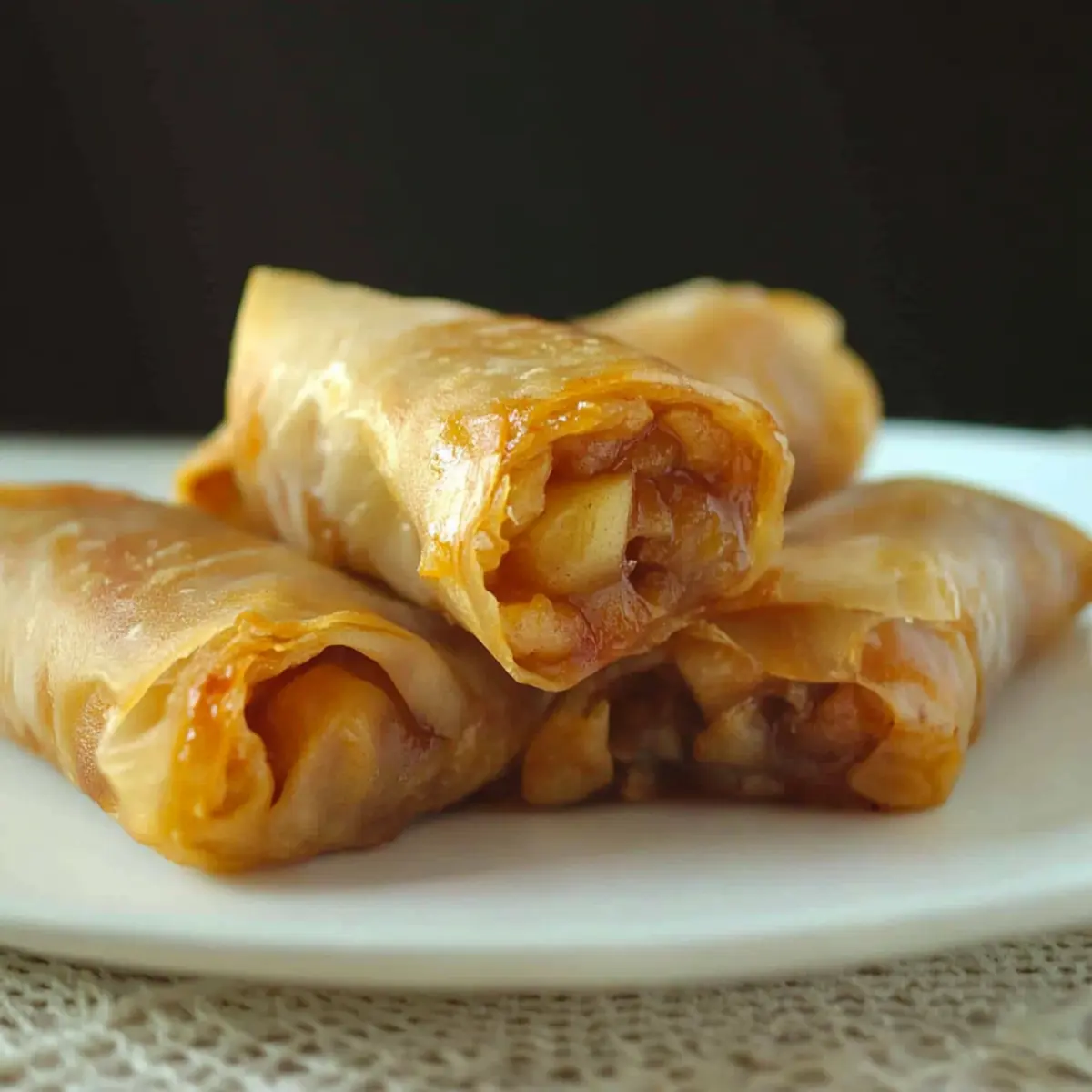 Room Temperature: For the best flavor and texture, enjoy your Baked Apple Pie Rice Paper Rolls fresh out of the oven. If left at room temperature, consume within 1-2 hours.