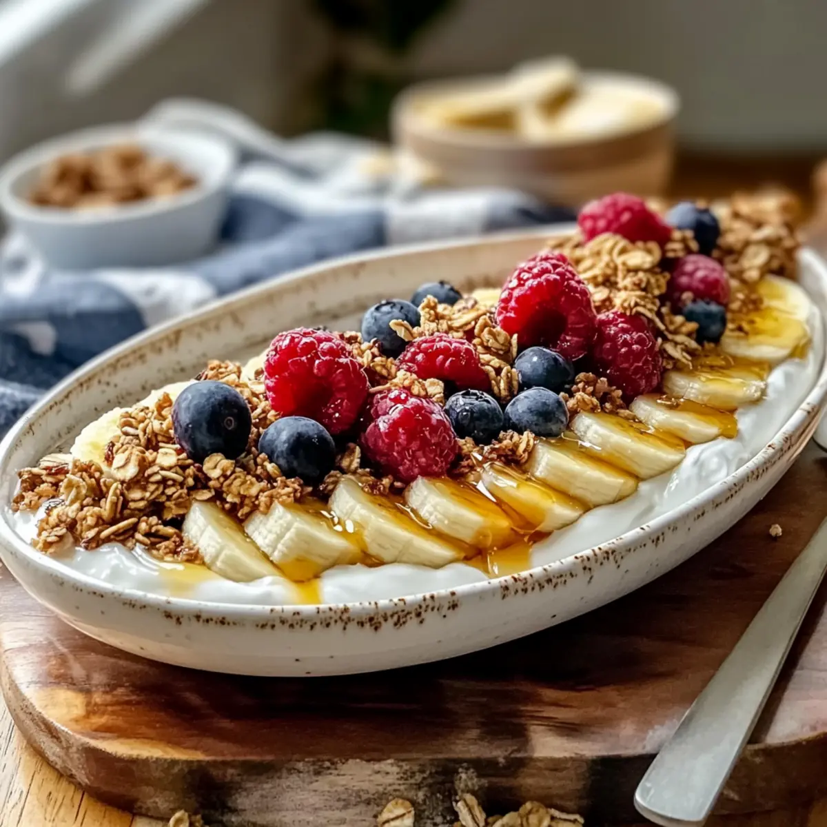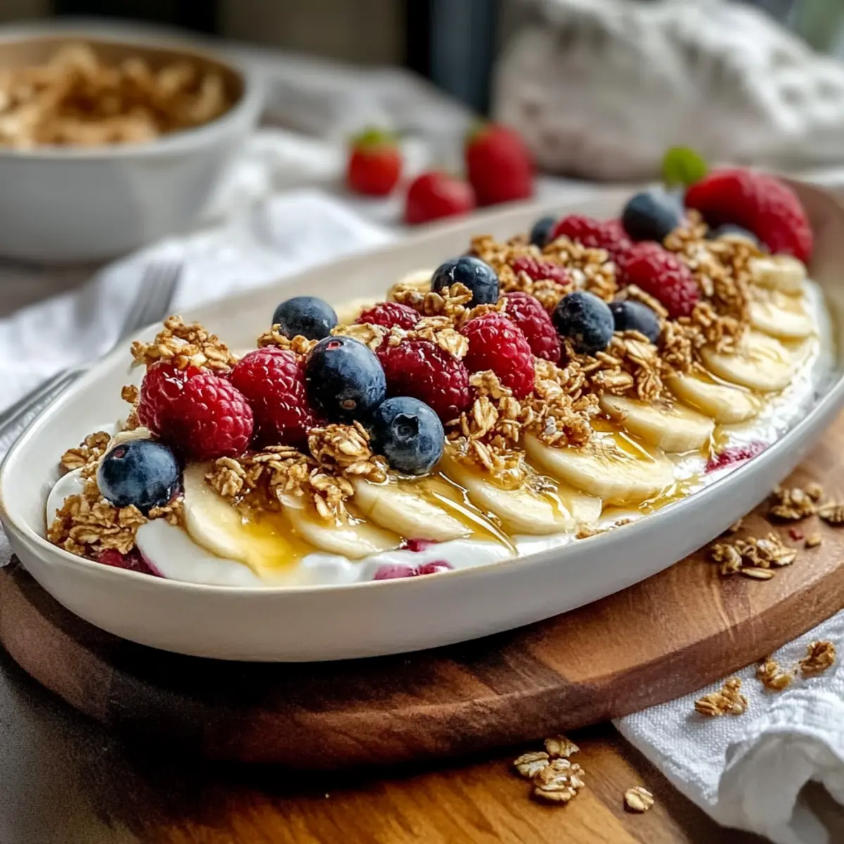 Just before serving, drizzle a touch of honey or maple syrup over the layered ingredients according to your taste. This enhances the overall sweetness and brings all the flavors together beautifully. A light drizzle will add a lovely sheen to your Breakfast Banana Split, inviting everyone to dig in.