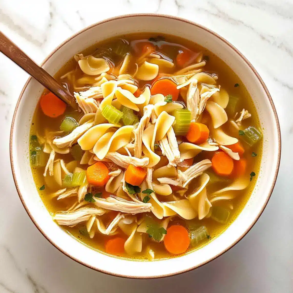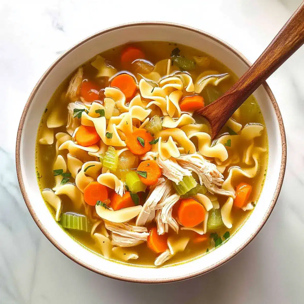 Ladle the Chicken Noodle Soup into bowls and garnish with fresh herbs if desired. Serve immediately, alongside some crusty bread for a satisfying meal. The combination of tender vegetables, succulent chicken, and hearty noodles creates a comforting experience that’s perfect for any cold day or when you need a nourishing lift!