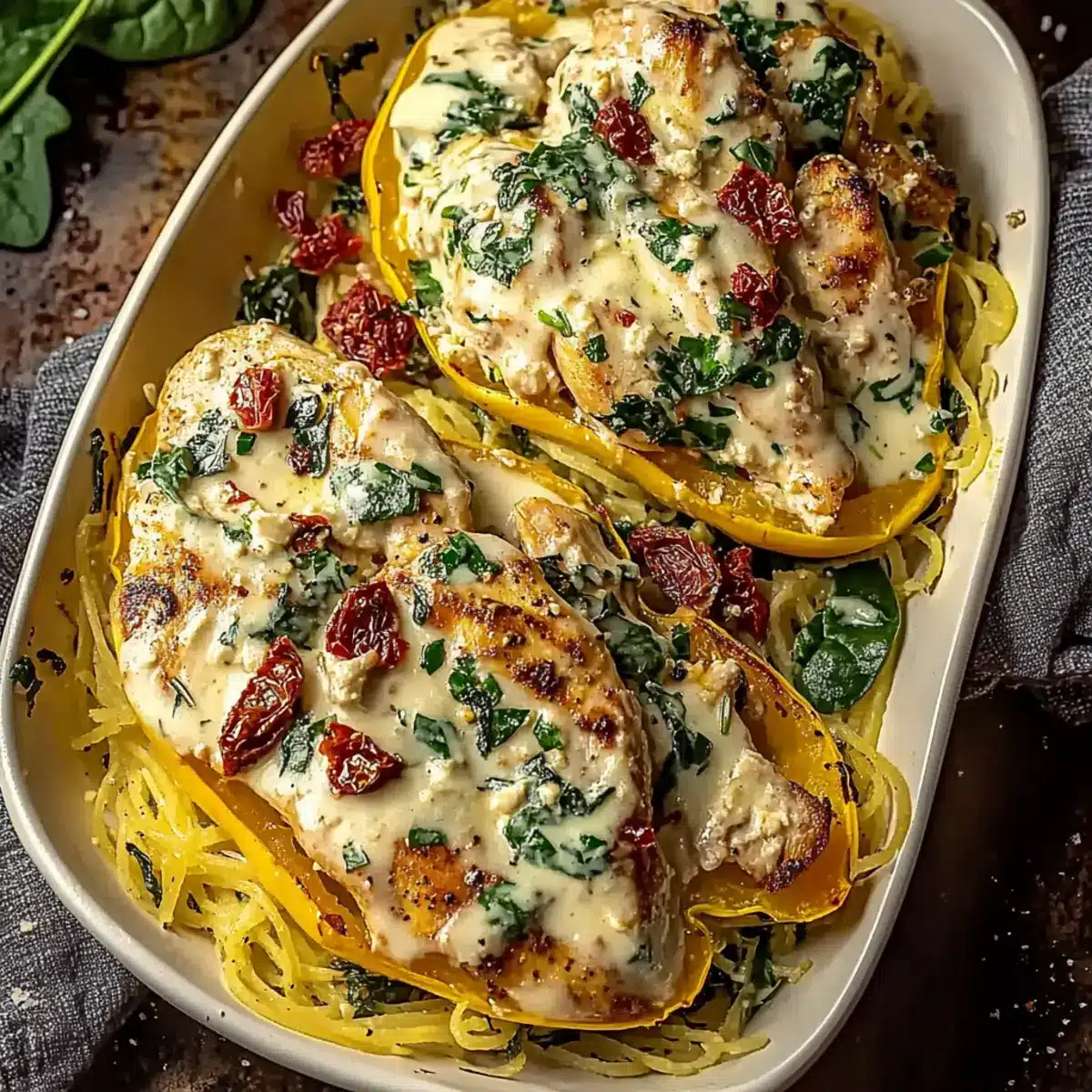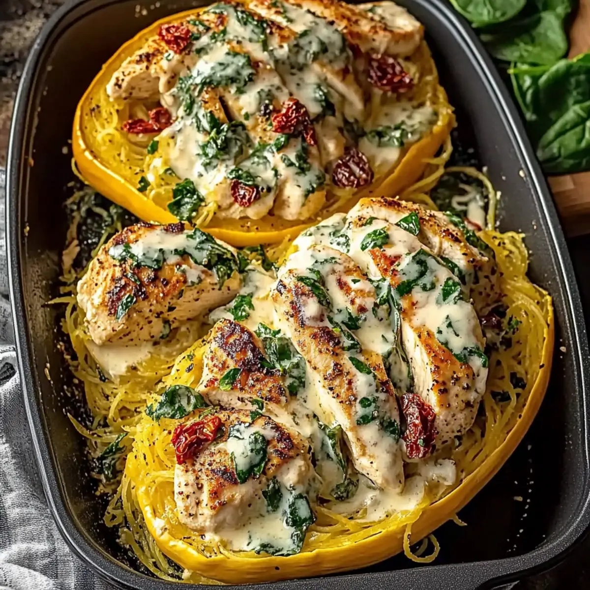 Add in the fresh spinach and sun-dried tomatoes, stirring until the spinach wilts, about 2 minutes. Then, gently fold in the shredded spaghetti squash, ensuring every strand is coated in that delicious creamy sauce. Once mixed, it’s a comforting bowl of Chicken Spaghetti Squash waiting to be served.