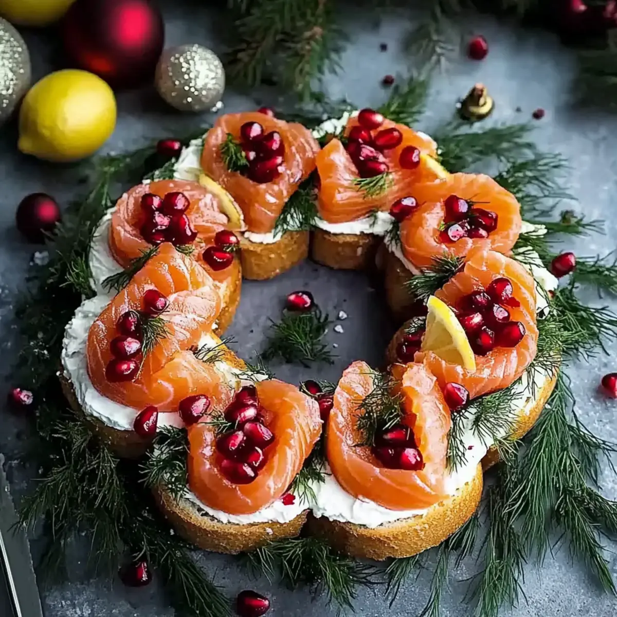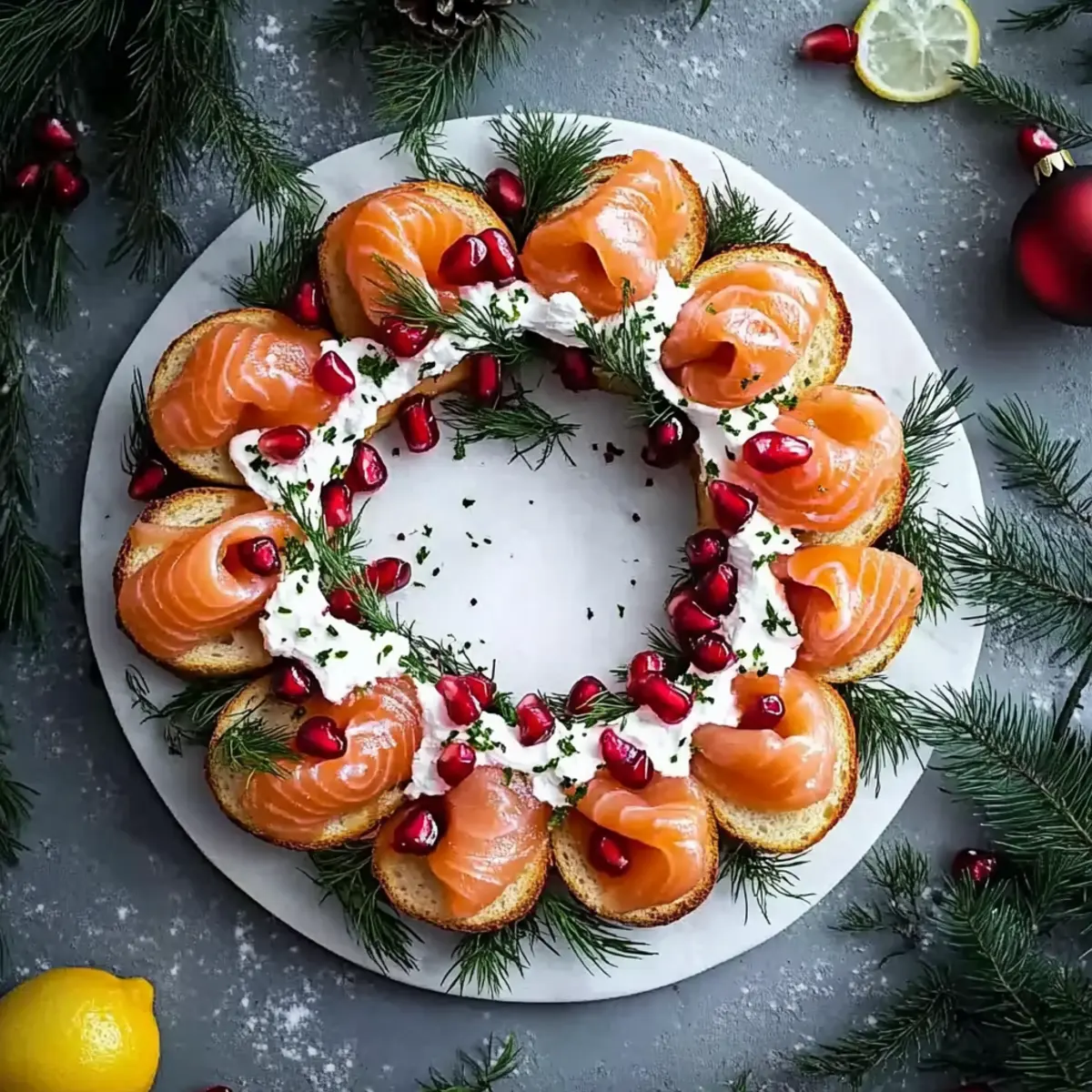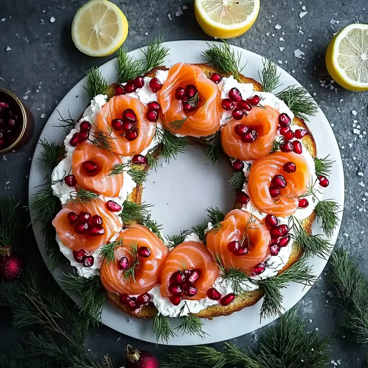 Sprinkle freshly grated lemon zest over the assembled wreath, followed by a scattering of bright pomegranate arils. This step introduces vibrant color and zest that complements the creamy and smoky flavors. The final garnish transforms your Christmas Smoked Salmon Bruschetta Wreath into a stunning centerpiece for your holiday gatherings.