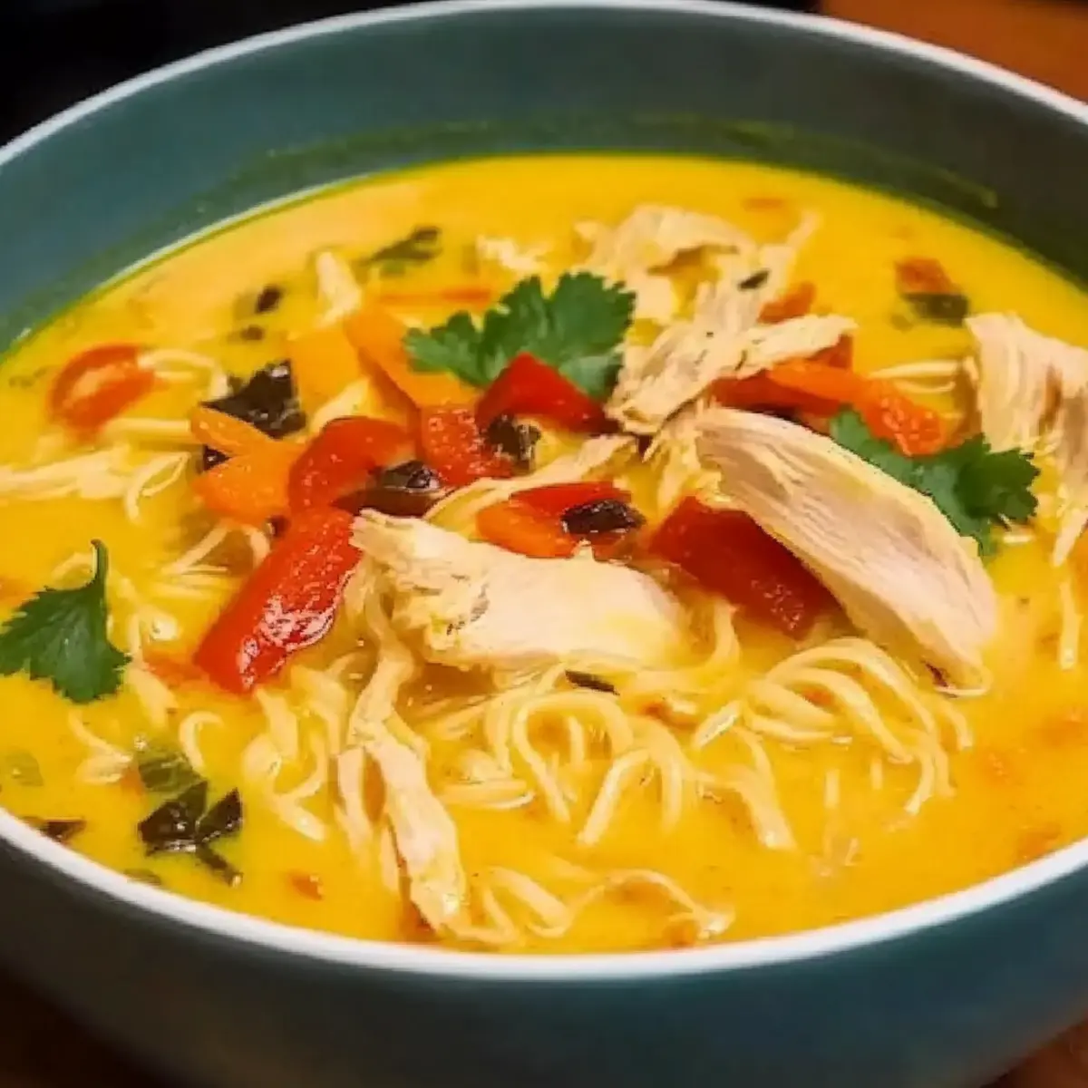 Ladle the creamy chicken noodle soup into warm bowls and serve immediately, garnishing with fresh cilantro or basil if desired. Relish the thick, aromatic broth and tender ingredients, perfect for warming your heart on any occasion.