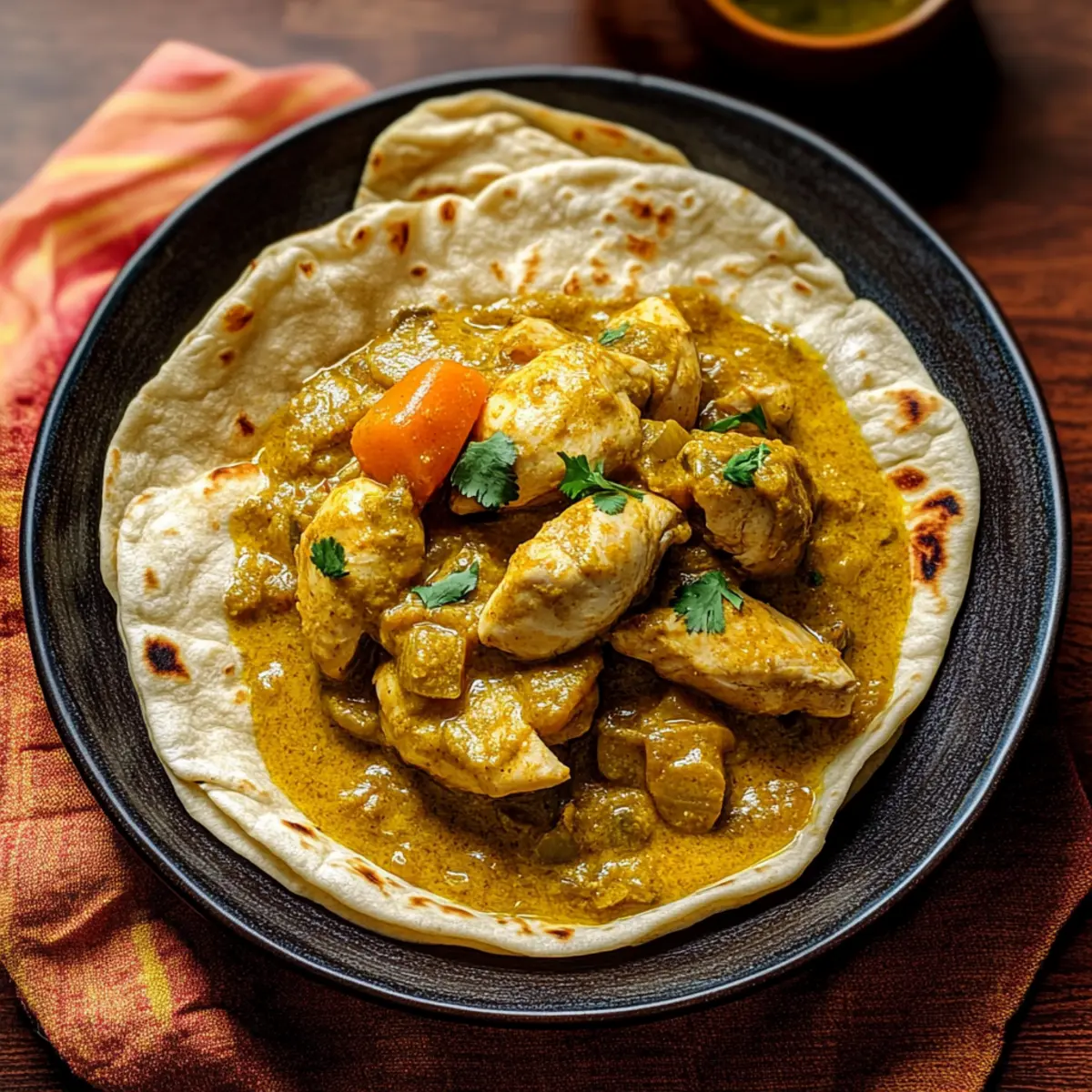 - Warm the roti flatbreads in a separate dry skillet for 1-2 minutes on each side.