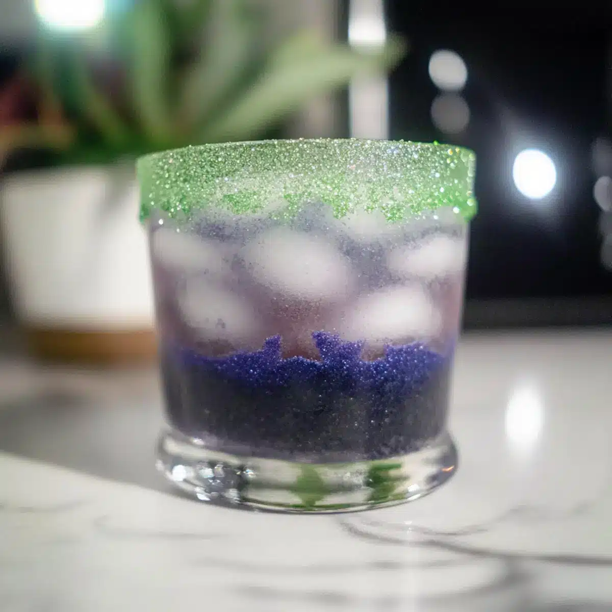 Begin by preparing your glass for the Drunk Witch Cocktail. Dip the rim of the glass into simple syrup to create a sticky surface. Next, gently roll the rim in green sugar until it’s evenly coated, forming a sweet and festive crust. Set the glass aside and allow the syrup to set while you prepare the cocktail.