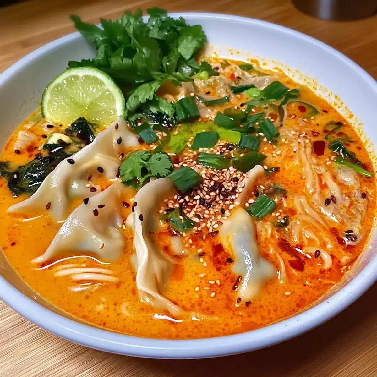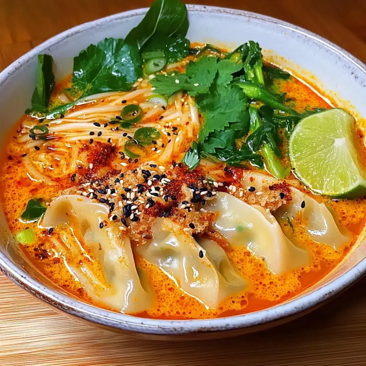 Ladle the hot broth over the noodles, bok choy, and gyoza in each bowl, ensuring every ingredient is bathed in that flavorful liquid. Top off your Easy Dumpling Soup with sliced scallions, a sprinkle of sesame seeds, a drizzle of chili oil, and lime wedges on the side. If you like, add crumbled seaweed sheets for an extra flavor punch before serving hot.