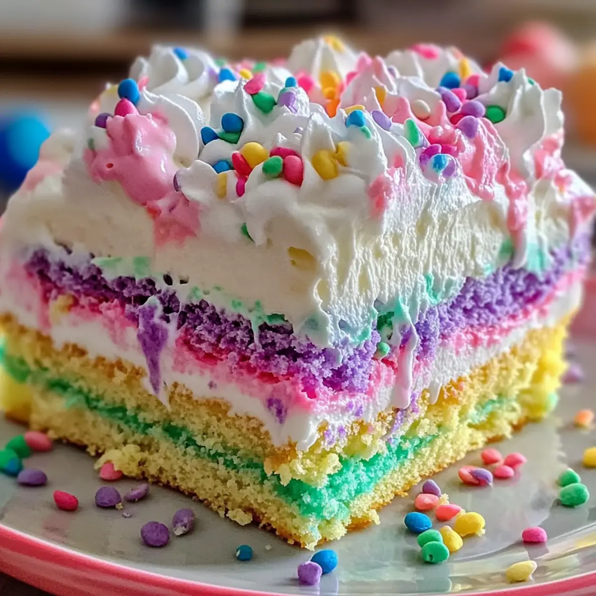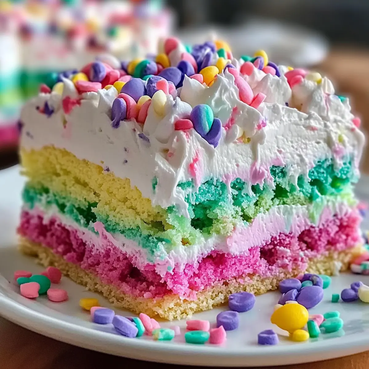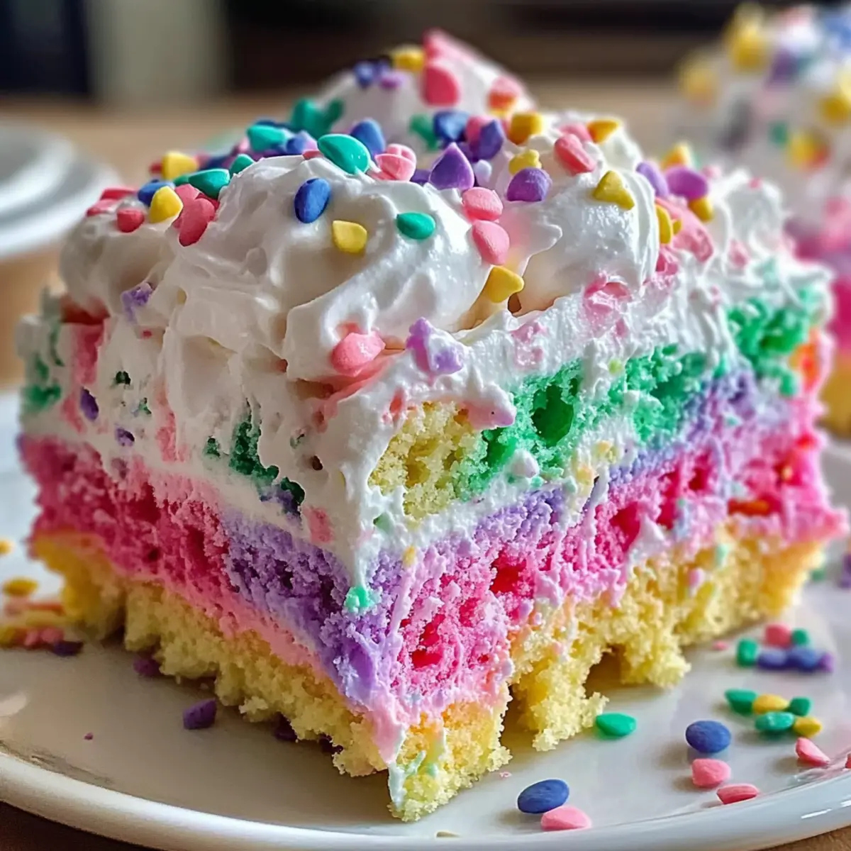 Vibrant colors: The Easter Poke Cake showcases eye-catching pastel swirls that will instantly elevate any gathering.
