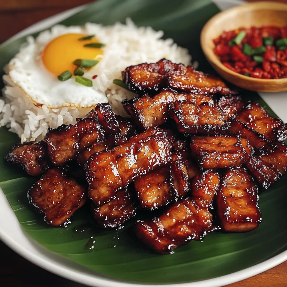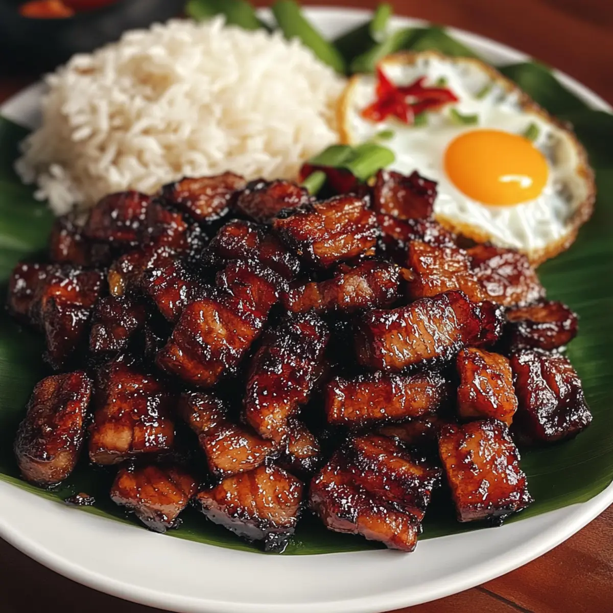 - Transfer the caramelized pork to a serving plate and serve with garlic fried rice and a fried egg.