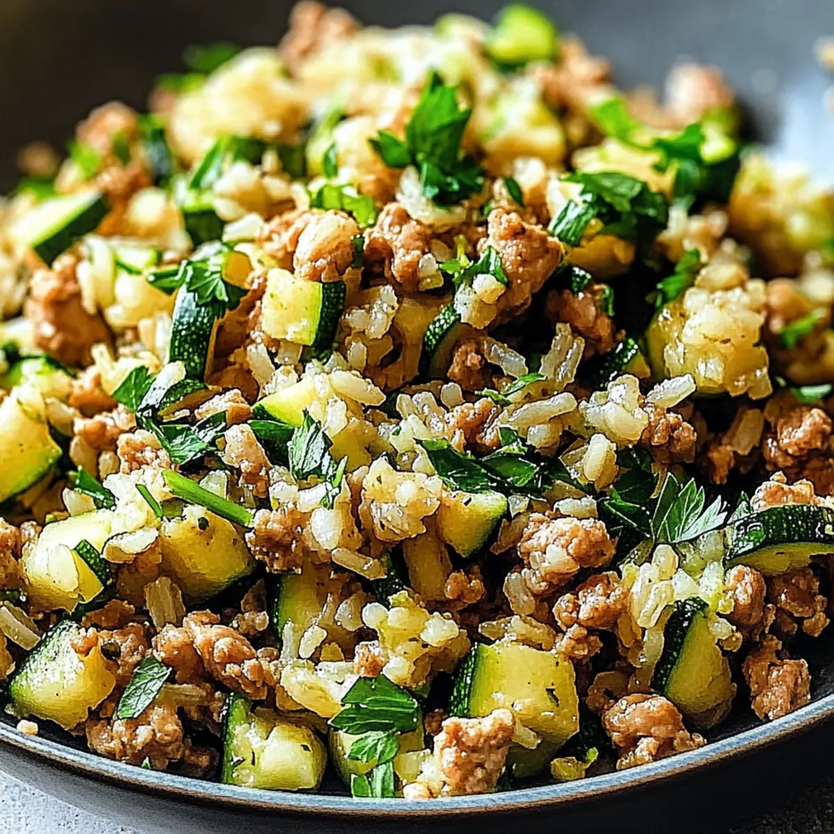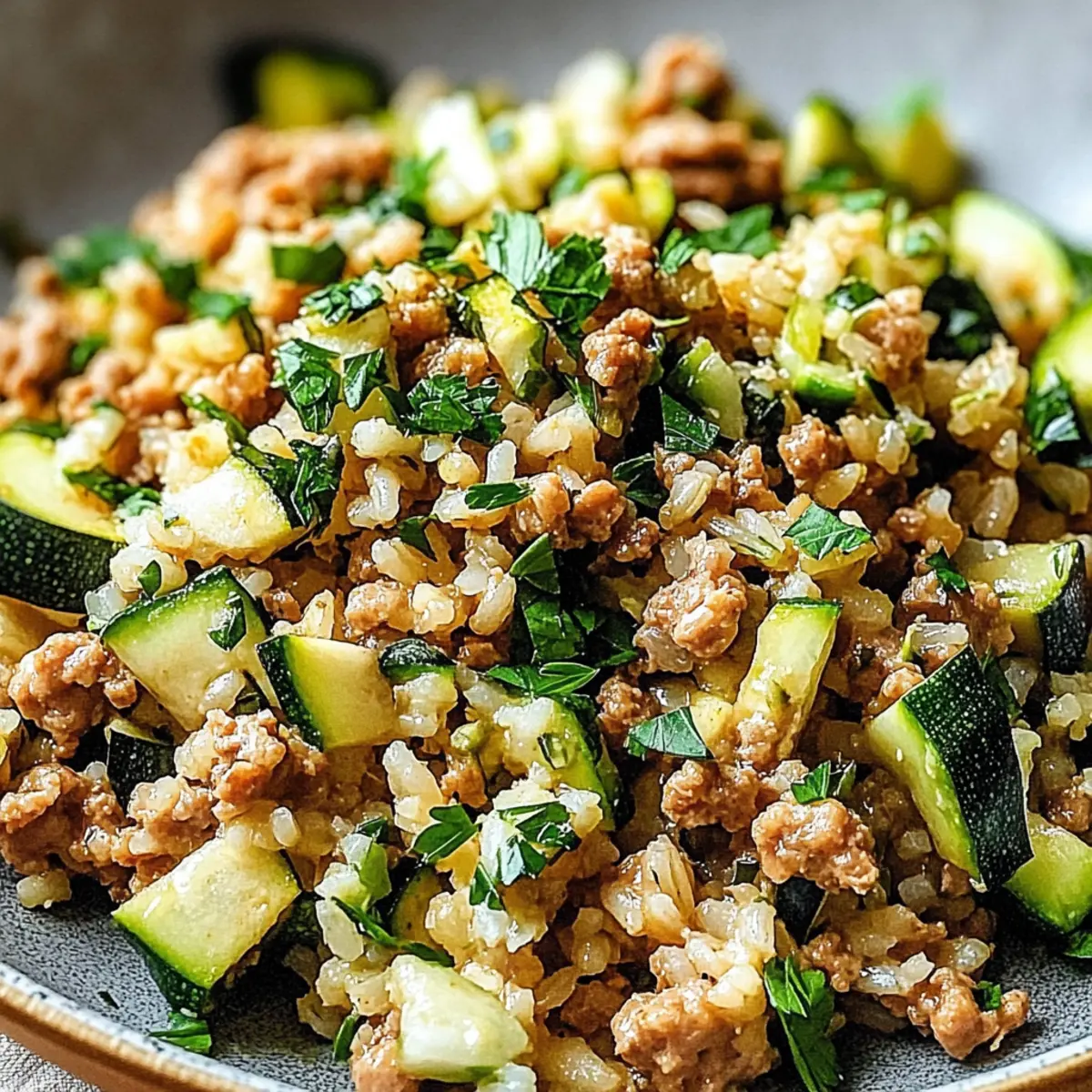 Finally, use a fork to fluff the rice gently and mix the chicken and vegetables. Serve your Ground Chicken Zucchini Rice Skillet warm, garnished with freshly chopped parsley for an extra pop of color and flavor. Enjoy this wholesome, one-pan delight with your loved ones!