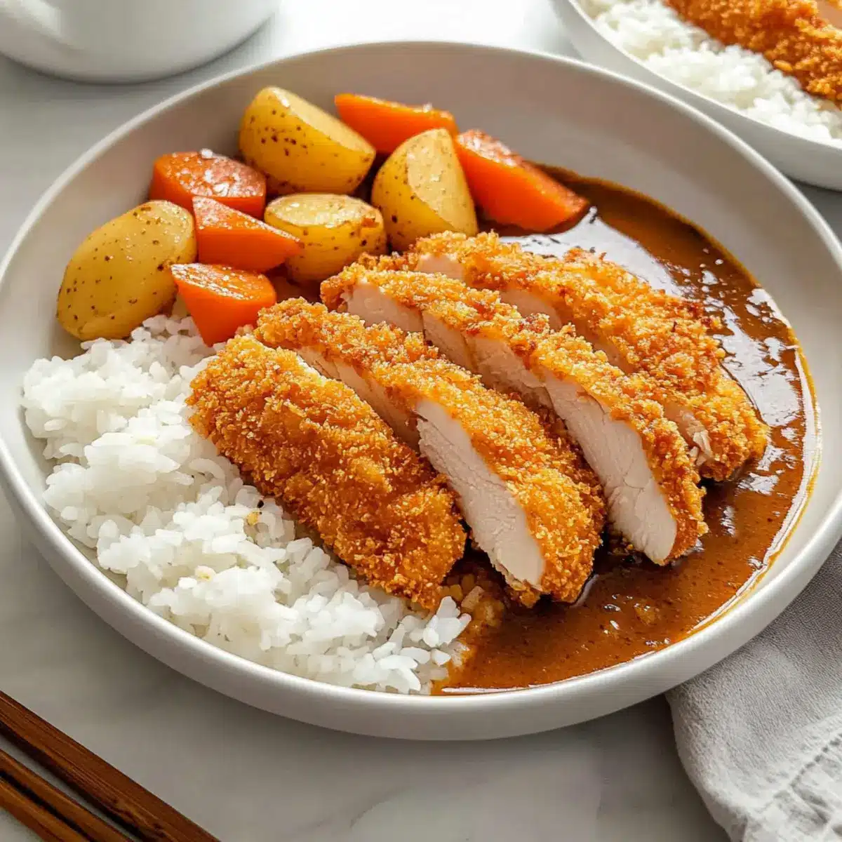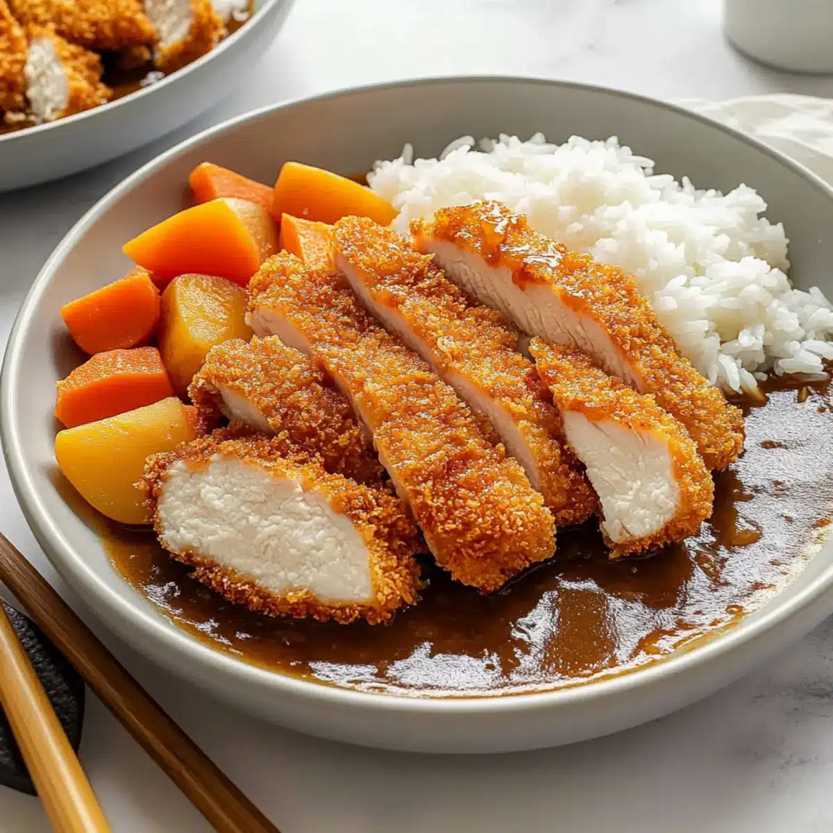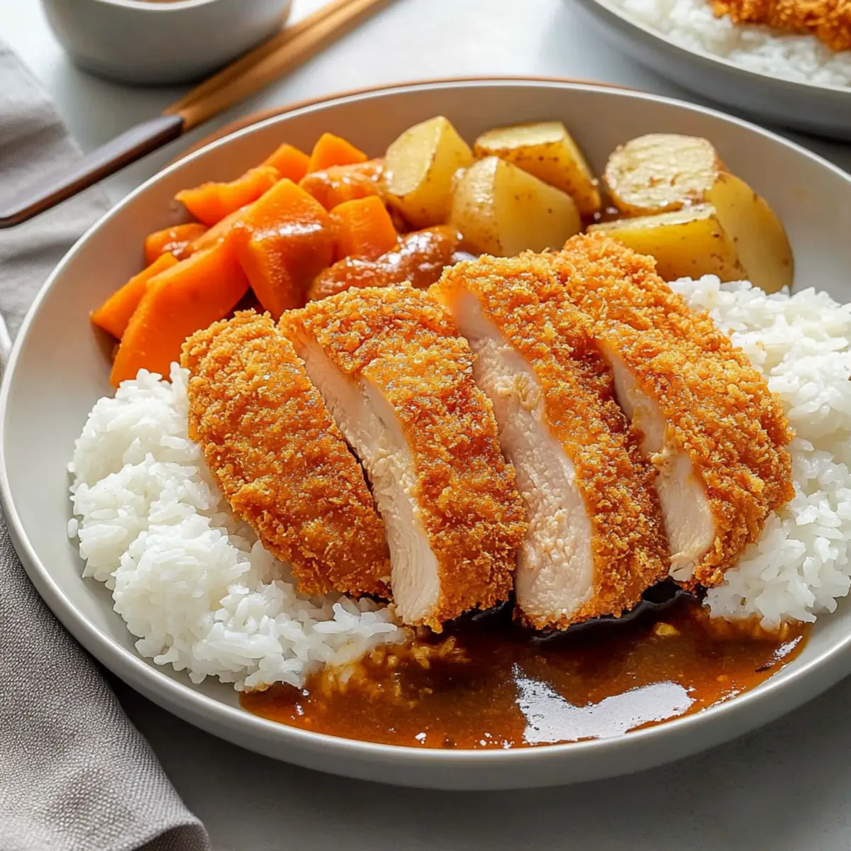 Once the chicken katsu is crispy and the curry sauce is rich and thick, slice the chicken into strips. Serve the warm, fluffy cooked white rice on plates, lay the chicken on top, and generously ladle the flavorful Japanese katsu curry over everything. Warm colors and aromas will invite everyone to the table for this delightful meal!