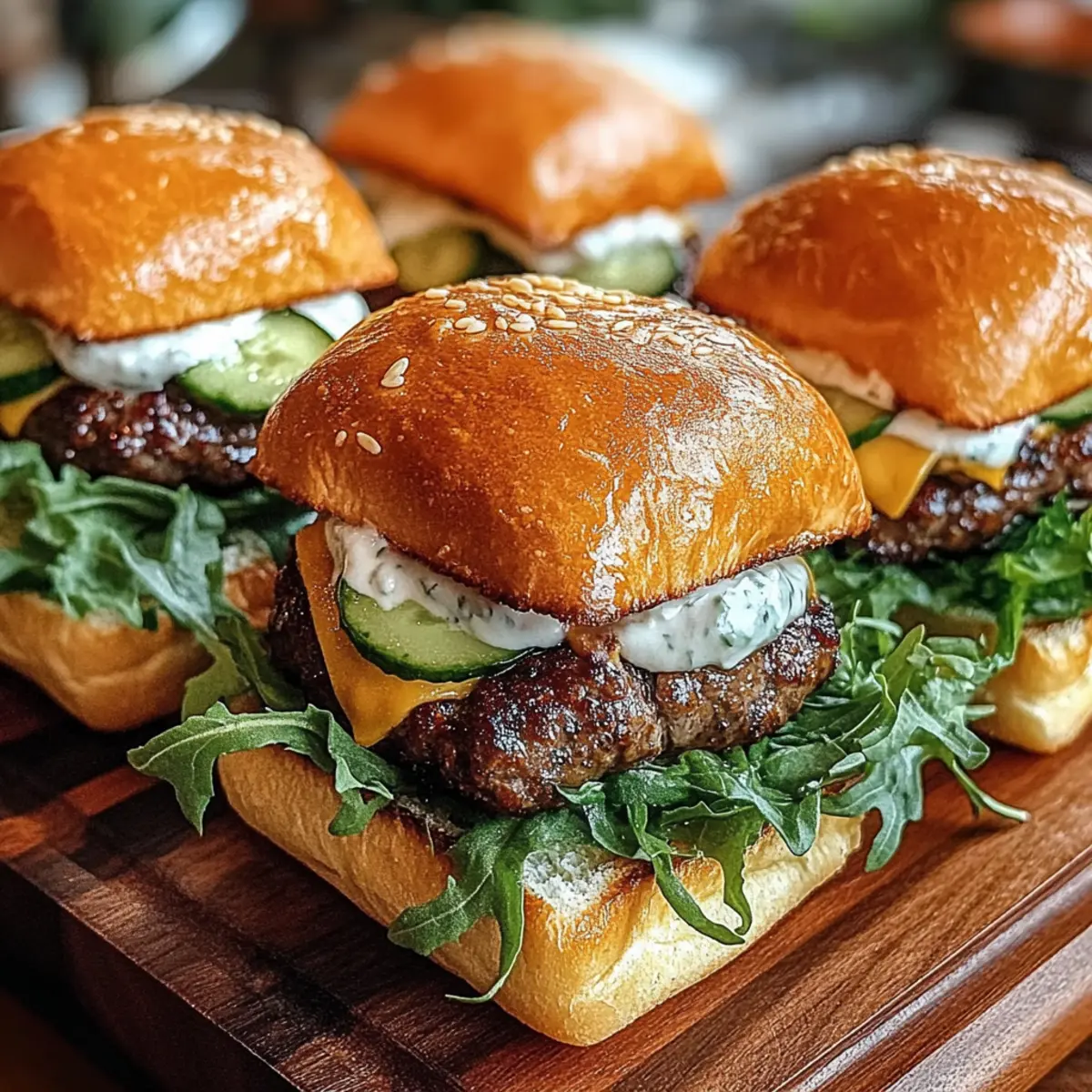 Once everything is cooked, it’s time to assemble your sliders! Start by spreading a generous layer of the silky garlic aioli on the bottom half of each toasted bun. Add a few mixed lettuce leaves, followed by the cheesy patty, and top with quick-pickled cucumber slices. Place the top bun over the slider and serve immediately for the most delightful flavor and freshness.