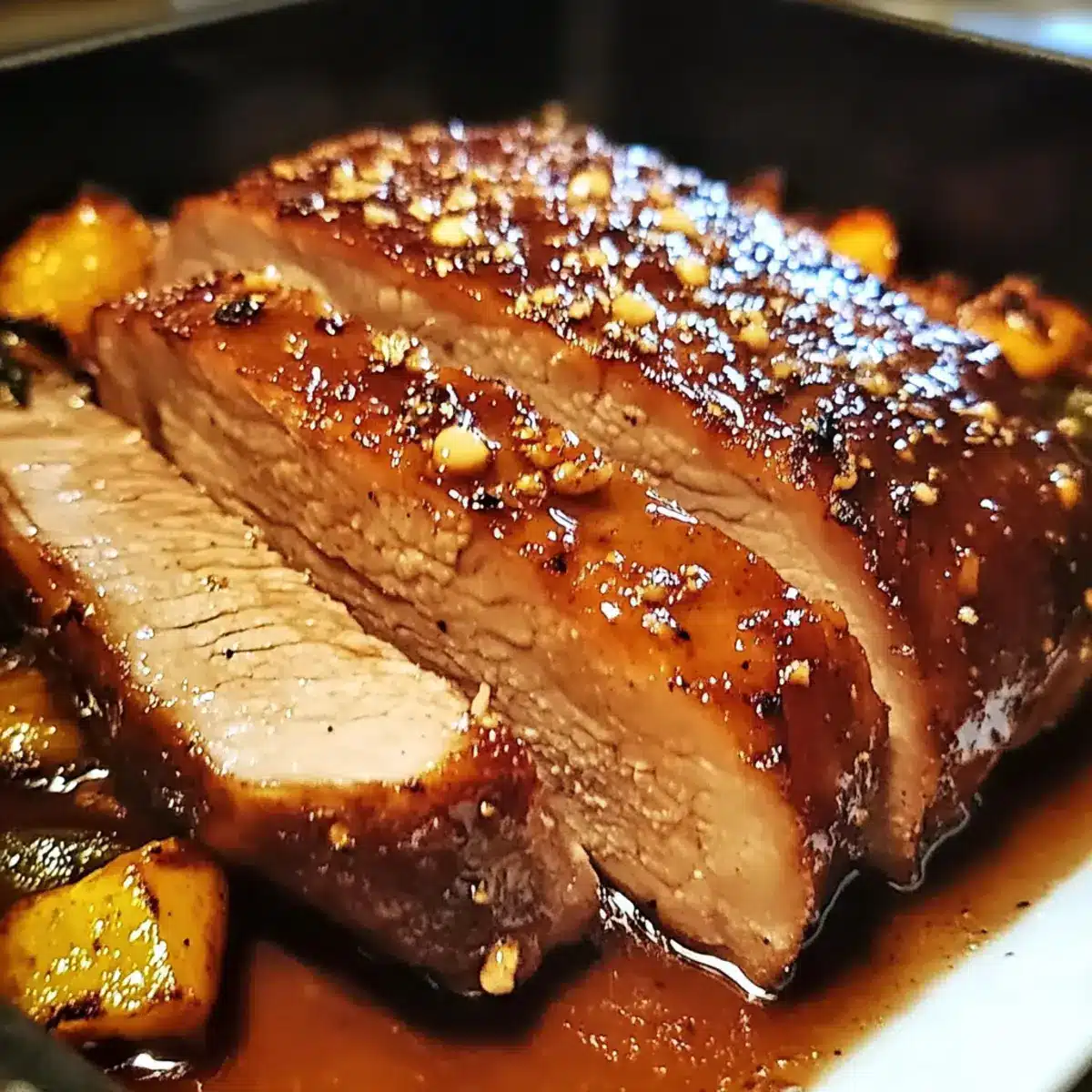 Transfer the seared pork loin to a baking dish, placing it fat side up. Pour the remaining marinade over the pork, covering it evenly. Place the baking dish in the preheated oven and roast for approximately 1 hour, or until the internal temperature reaches 145°F (63°C). This roasting will caramelize the glaze, creating a delectable crust around the tender meat.
