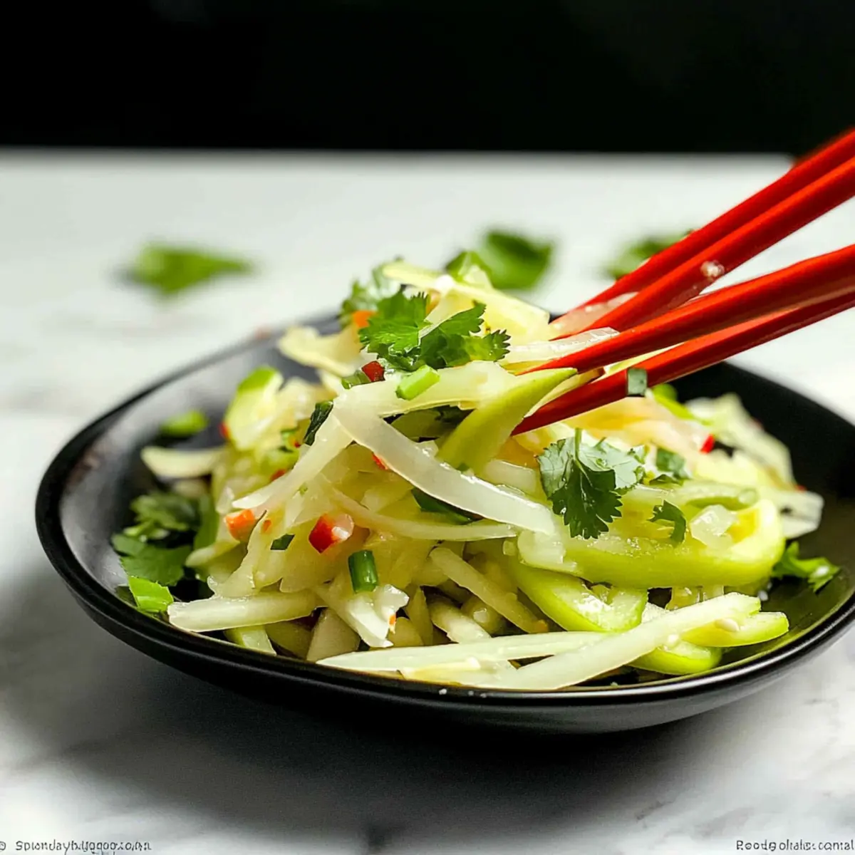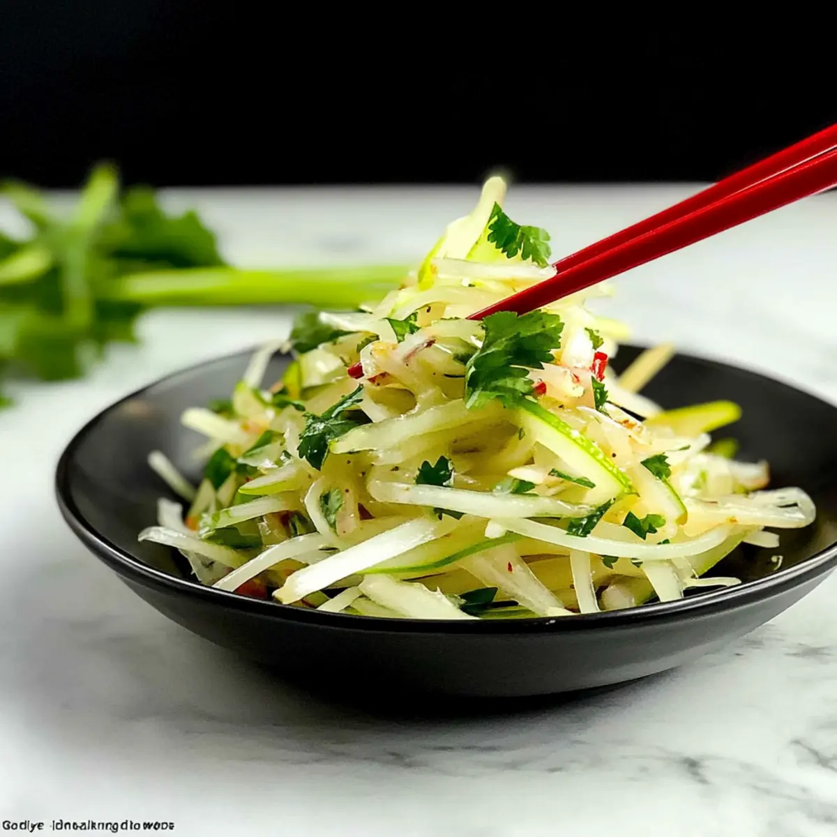 - In a large mixing bowl, combine Asian pears, celery, cilantro, green onions, and sliced Thai chili. Drizzle the dressing over the top and toss gently.