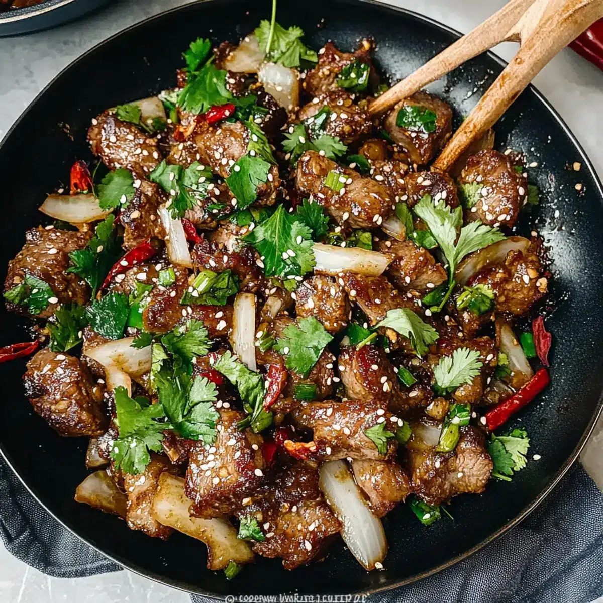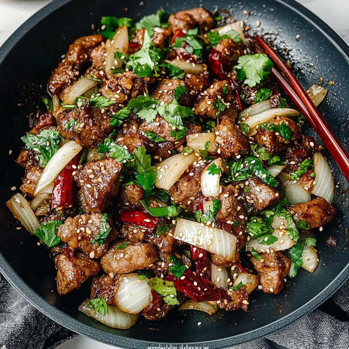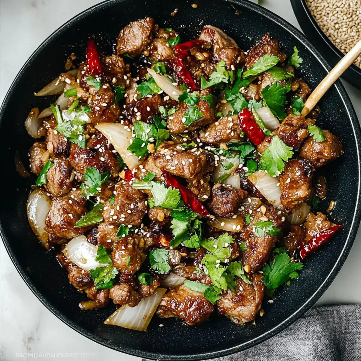 Finally, stir in the freshly chopped cilantro to bring a burst of color and fresh flavor to the dish. Cook for an additional 30 seconds, allowing the cilantro to wilt slightly. Serve your Real-Deal Xinjiang Cumin Lamb immediately on a large plate, garnishing with optional toasted sesame seeds for added texture.