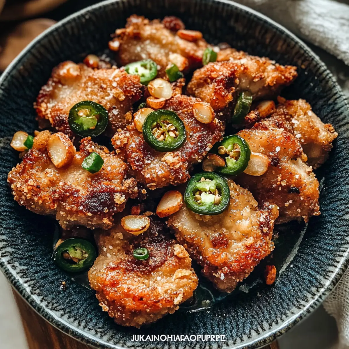 While the pork is still hot, combine the fried pieces in a large bowl with the fried garlic and jalapeno. Sprinkle the prepared salt and pepper mix over the pork and toss everything together gently to ensure even coverage. This final step enhances the flavor and brings all the delicious elements of your crispy salt and pepper pork chops together beautifully.