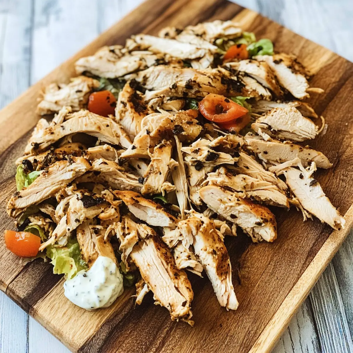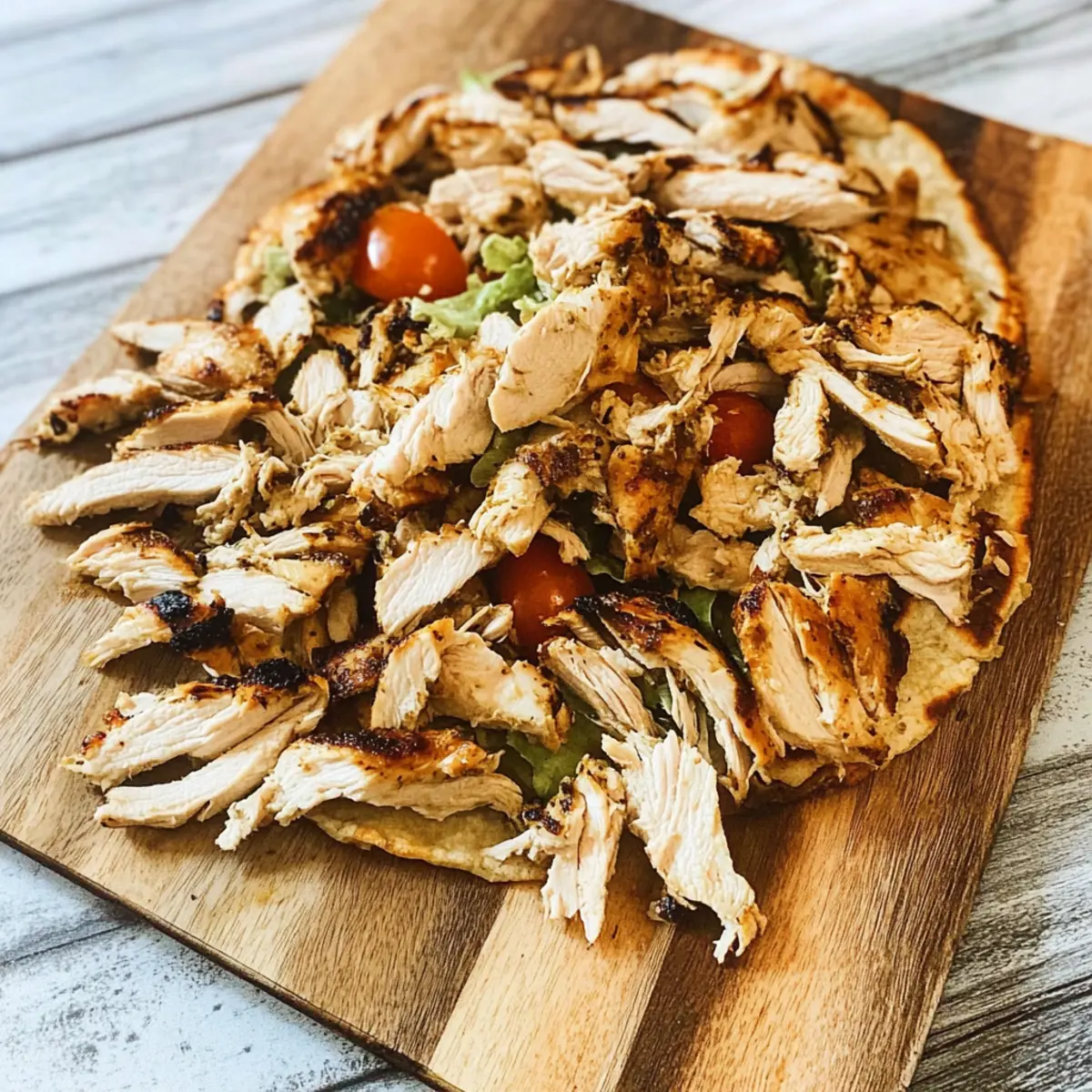 - Assemble the dish by placing shredded chicken in a flatbread with lettuce, cucumber, red pepper, and tomatoes, then drizzle with yogurt sauce.