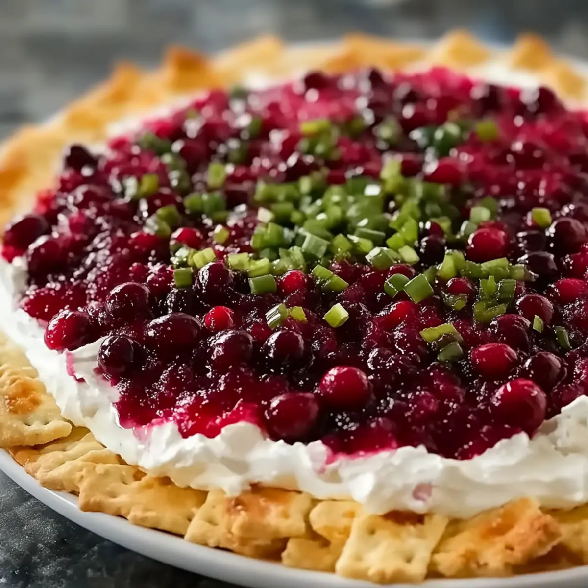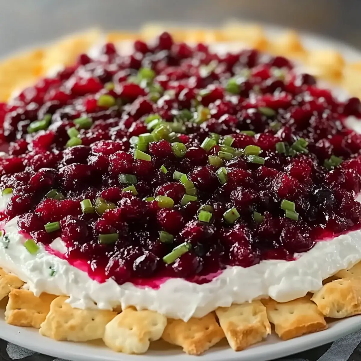- Layer the chilled cranberry-jalapeno mixture generously over the cream cheese, covering every inch.