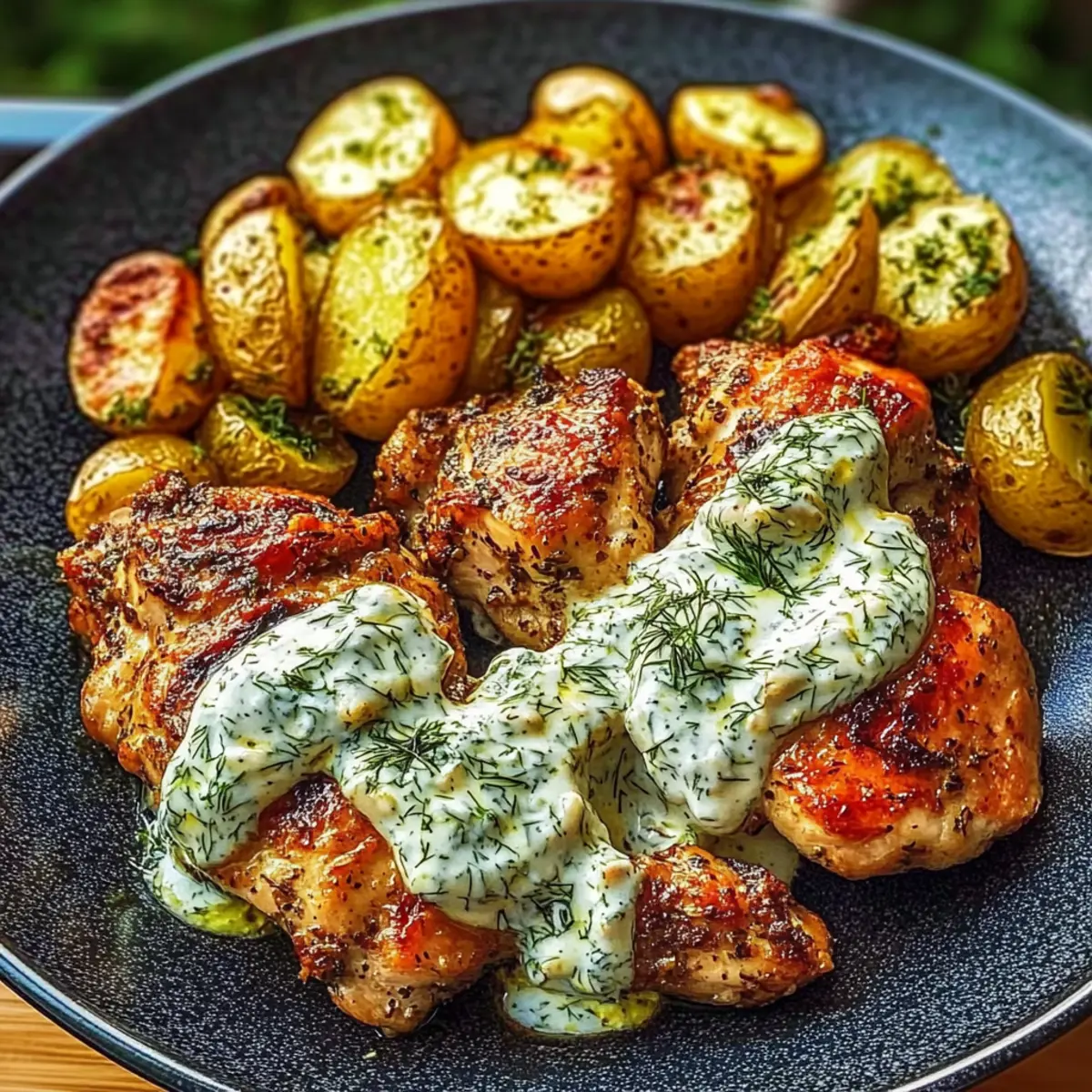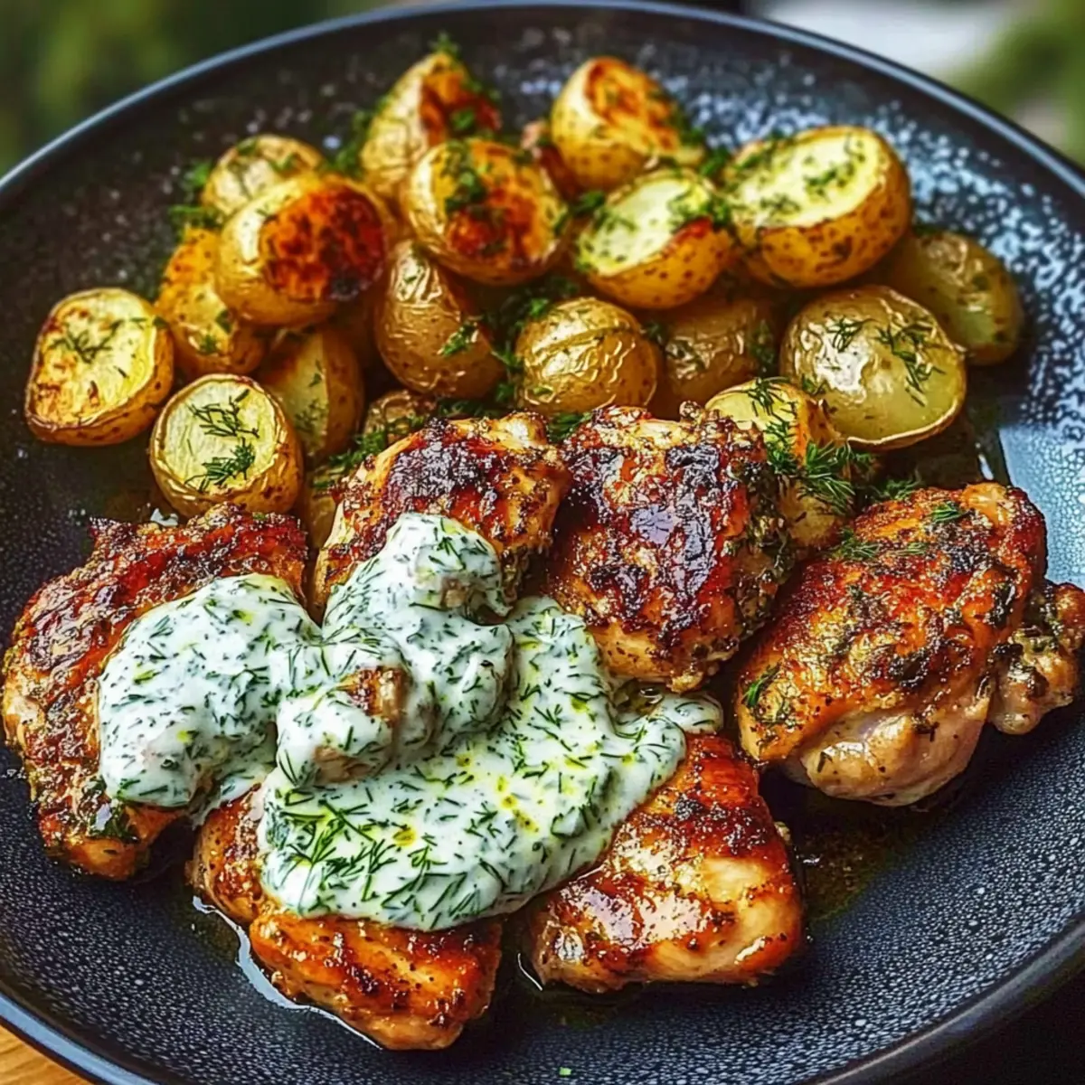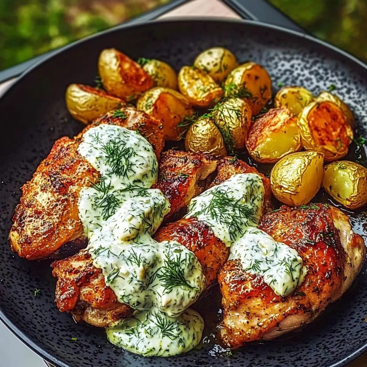 - Serve This Delightful Dish: Plate the chicken with the crispy baby potatoes and drizzle with the dill feta cream.